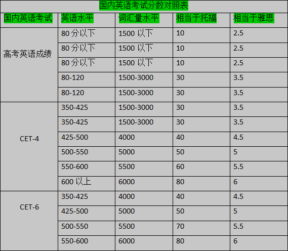 經(jīng)常碰到有同學(xué)問(wèn),“老師,我的四級考試考了425,想要托??嫉?0分還有多遠?”“我高考130分,相當于托福雅思多少呢?”“托福雅思如何換算”。今天大洋雅思根據老師教學(xué)經(jīng)驗及ETS官方工具來(lái)制作了英語(yǔ)水平對照表,大家不妨作為參考!
