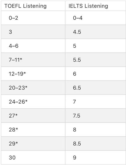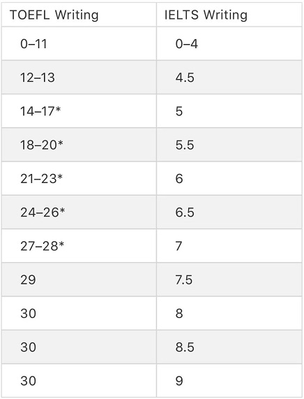 *Indicates score comparison ranges with the highest degree of confidence. The data is based on the analysis of 1,153 individuals who took both the TOEFL test and the IELTS academic module.
