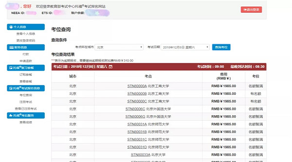 點(diǎn)擊頁(yè)面左側“托??荚噲竺莻€(gè)信息中的“考位查詢(xún)”,選在考點(diǎn)所在城市和考試日期后,點(diǎn)擊“查詢(xún)考位“即可看到剩余考位情況